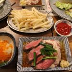 Nous jetons notre dévolu sur un petit restaurant où il semble y avoir des yakitori (brochettes japonaises). Nous y sommes très bien accueillis, même s’il nous semble que le menu anglais n’est pas aussi fourni que ce que nous pensions, car les plats que nous voyions depuis l’extérieur n’étaient pas sur la carte (pas de yakitori…). Malgré tout, les plats servis étaient très bons, mais un peu cher pour la quantité. On soupçonne d’ailleurs que les étrangers payent plus cher.