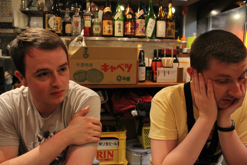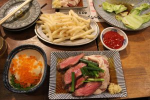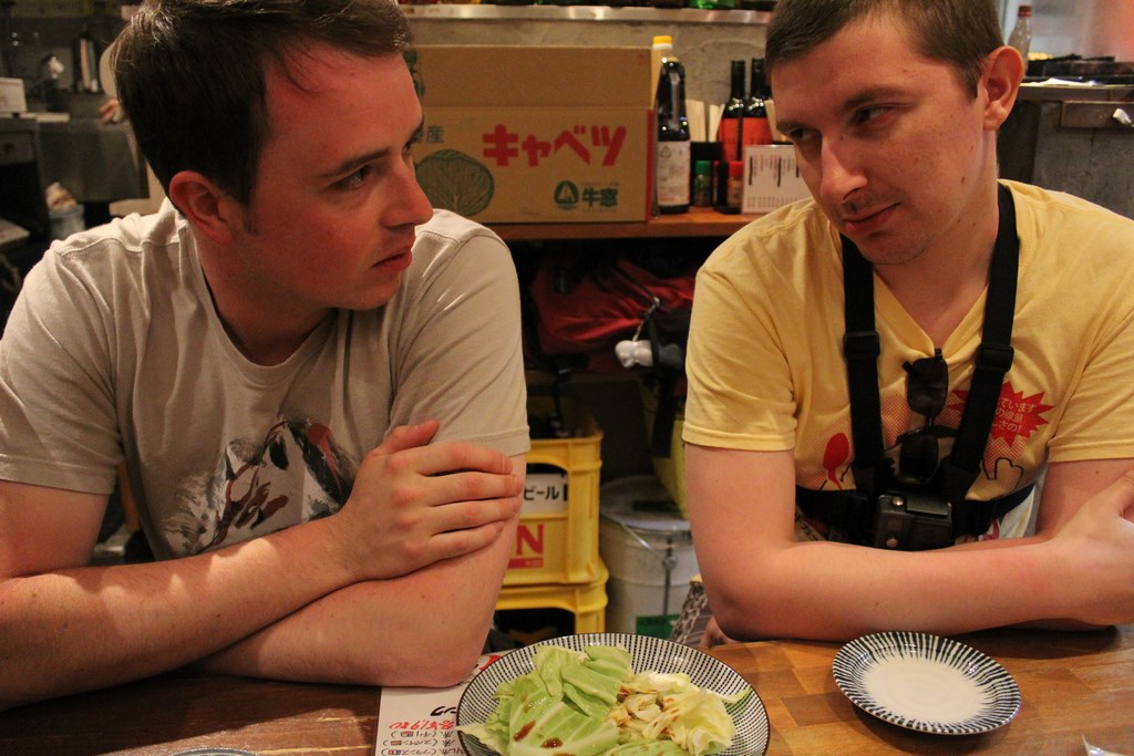 Nous jetons notre dévolu sur un petit restaurant où il semble y avoir des yakitori (brochettes japonaises). Nous y sommes très bien accueillis, même s’il nous semble que le menu anglais n’est pas aussi fourni que ce que nous pensions, car les plats que nous voyions depuis l’extérieur n’étaient pas sur la carte (pas de yakitori…). Malgré tout, les plats servis étaient très bons, mais un peu cher pour la quantité. On soupçonne d’ailleurs que les étrangers payent plus cher.