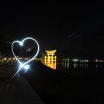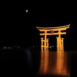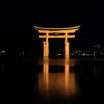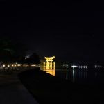 Une fois sorti du restaurant, nous profitons du ciel dégagé pour effectuer une petite séance de photographie nocturne. La marée est haute, et le torii, qui est éclairé, à les pieds dans l’eau, ce qui en fait la cible d’une dizaine de photographes amateurs.