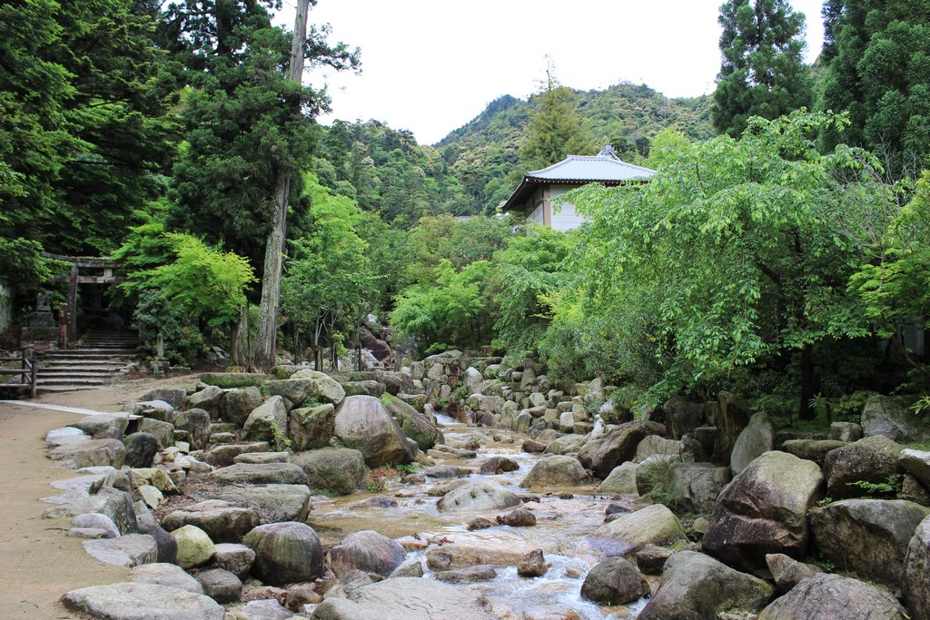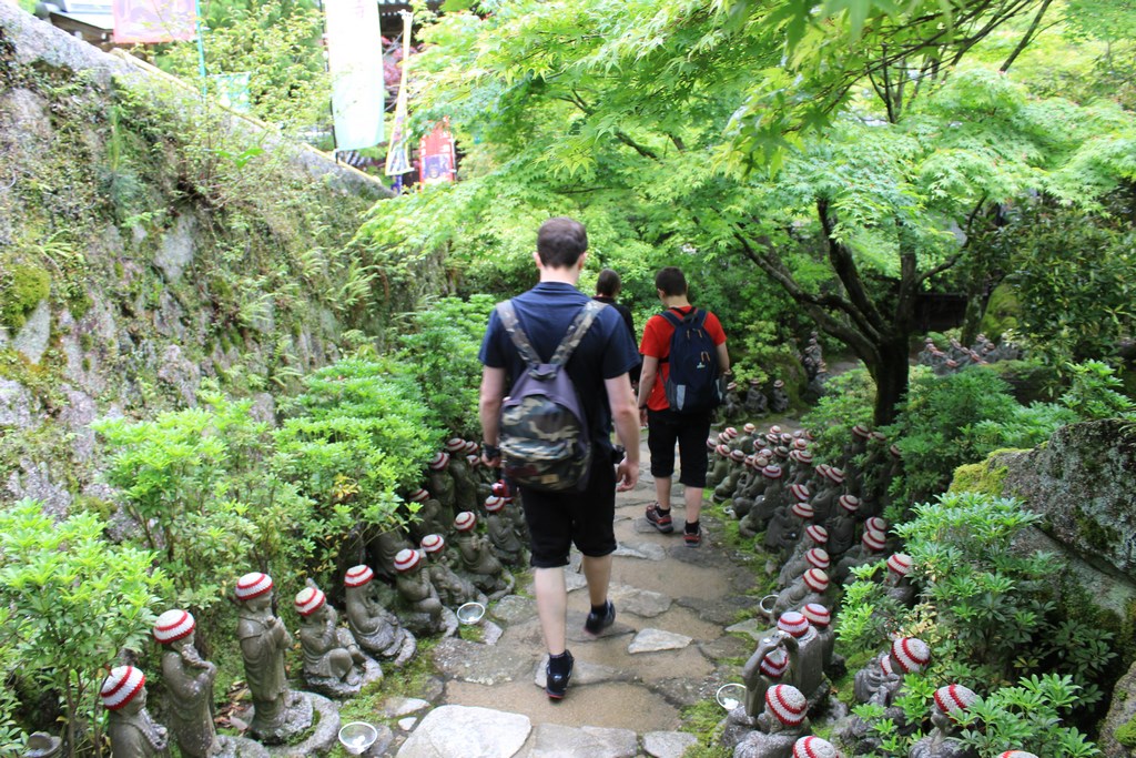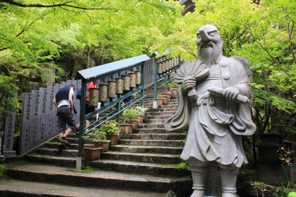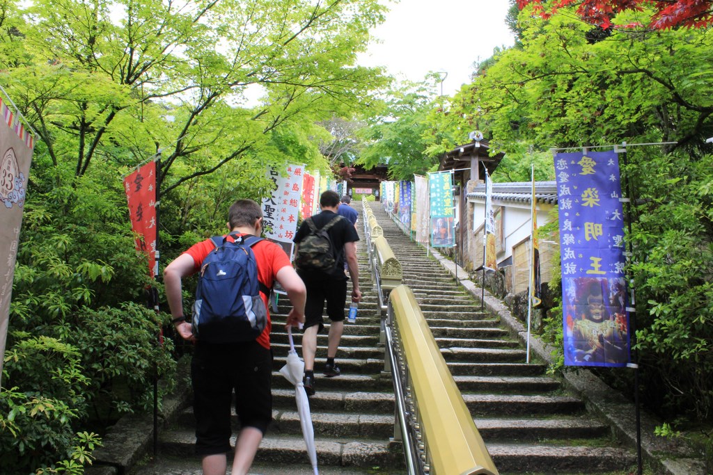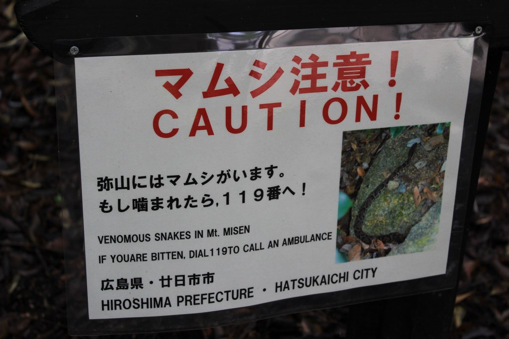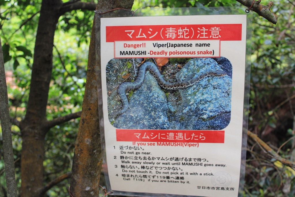 Le chemin que nous prenons pour débuter la randonnée passe par le temple Daishoin. Après avoir fait le tour des allées, nous prenons la direction du Mont Misen. Le chemin jusqu’au sommet est majoritairement composé d’escaliers. Avec la pluie de la veille, certaines marches sont glissantes, et il faut donc être vigilant, et prendre garde de ne les tomber. Autre raison d’être vigilant, plusieurs panneaux sont affichés, informant du danger des serpents. Pas très rassurant… Nous faisons donc attention où nous mettons les pieds, et ne nous éloignons jamais du sentier principal.