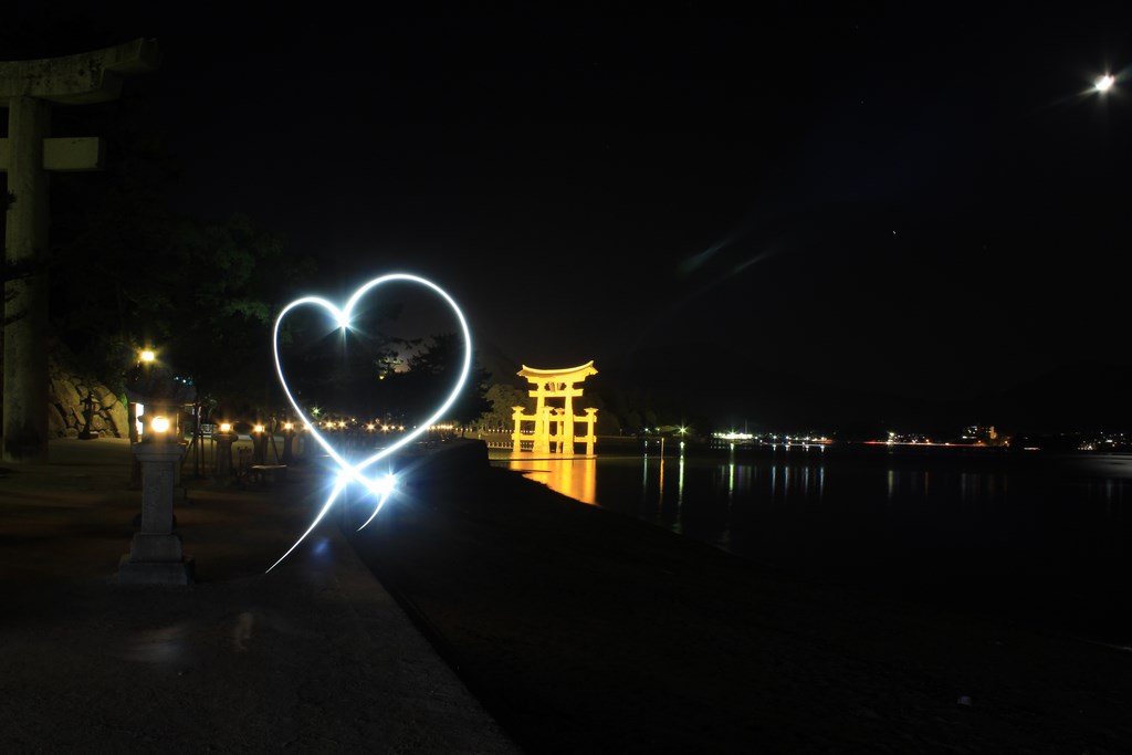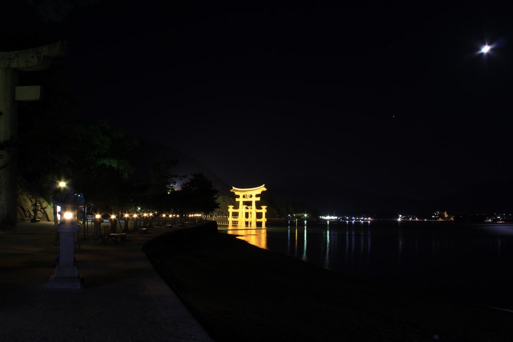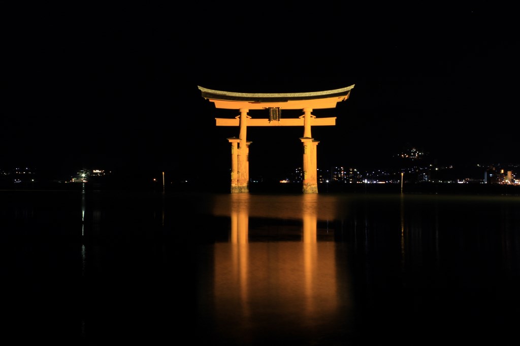 Une fois sorti du restaurant, nous profitons du ciel dégagé pour effectuer une petite séance de photographie nocturne. La marée est haute, et le torii, qui est éclairé, à les pieds dans l’eau, ce qui en fait la cible d’une dizaine de photographes amateurs.
