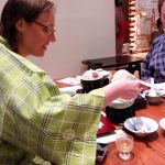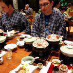 Notre séjour est en demi-pension, et le dernier service étant à 19h, nous nous retrouvons à table quelques heures plus tôt que nos habitudes depuis ces dix derniers jours. Le repas dans un ryokan est la plus grande crainte de Julien, car on y sert généralement des plats typiques loin de ce que nous, occidentaux, connaissons. Ça a bien été le cas. Il était très difficile pour nous d’identifier tout ce que nous mangions, mais les plats, copieusement garnis, étaient principalement composés de poissons, de fruits de mer, d’algues,et de légumes marinés. Vincent et moi avons tout essayé, bien que certains plats ne soient pas franchement à notre goût, mais pour les autres, cela a été un peu plus difficile. Heureusement pour eux, il y avait un bol de riz pour combler leur appétit.