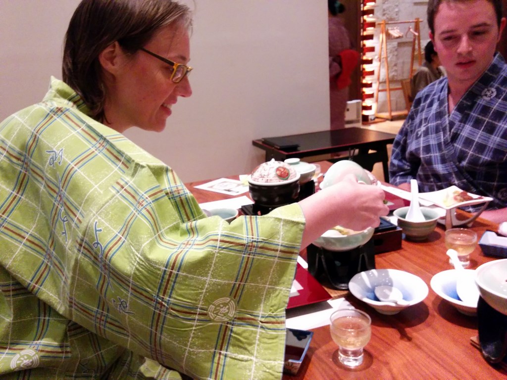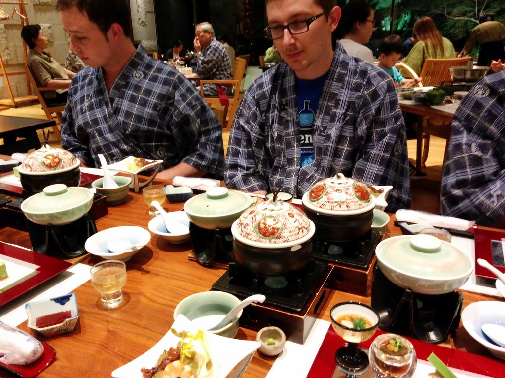 Notre séjour est en demi-pension, et le dernier service étant à 19h, nous nous retrouvons à table quelques heures plus tôt que nos habitudes depuis ces dix derniers jours. Le repas dans un ryokan est la plus grande crainte de Julien, car on y sert généralement des plats typiques loin de ce que nous, occidentaux, connaissons. Ça a bien été le cas. Il était très difficile pour nous d’identifier tout ce que nous mangions, mais les plats, copieusement garnis, étaient principalement composés de poissons, de fruits de mer, d’algues,et de légumes marinés. Vincent et moi avons tout essayé, bien que certains plats ne soient pas franchement à notre goût, mais pour les autres, cela a été un peu plus difficile. Heureusement pour eux, il y avait un bol de riz pour combler leur appétit.