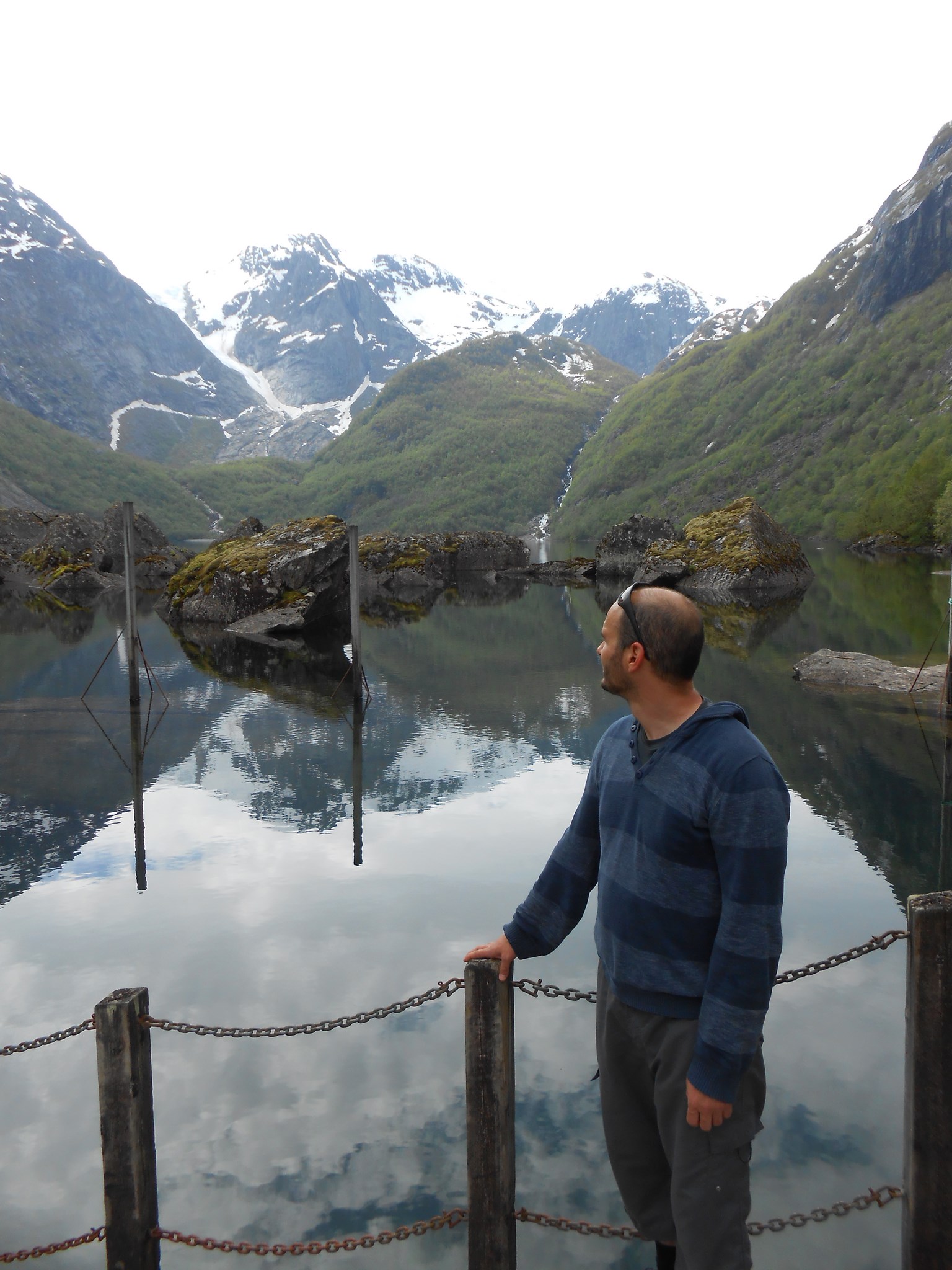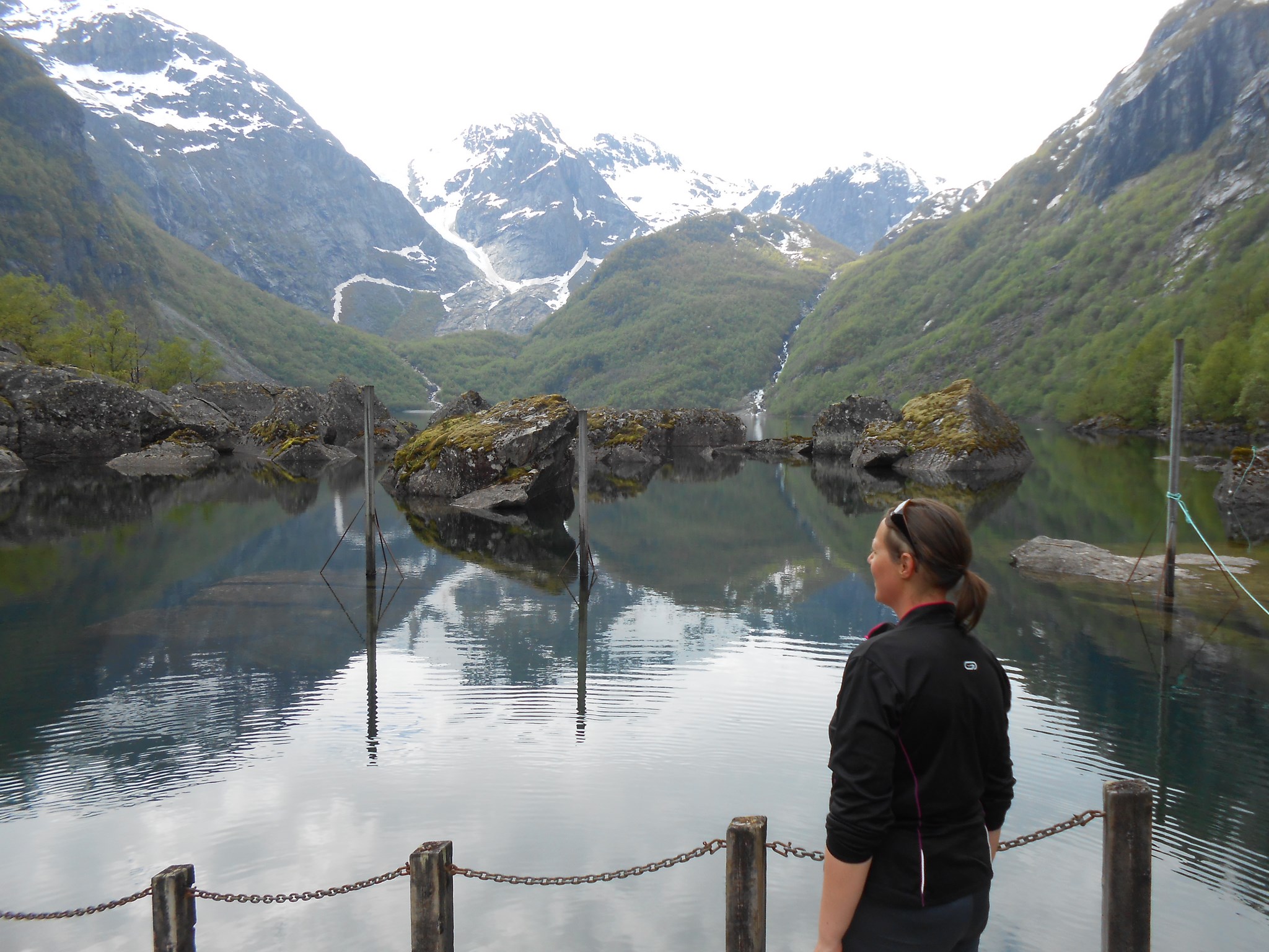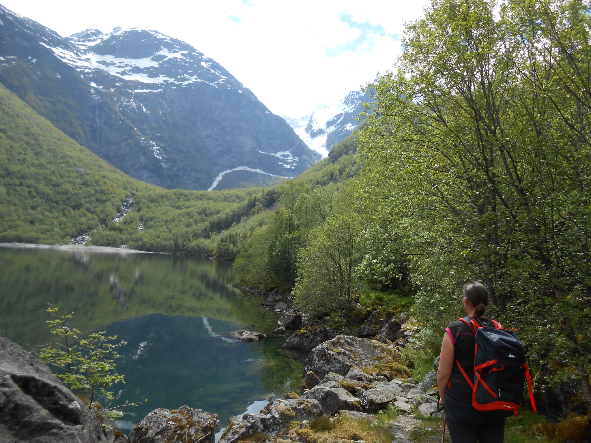 La randonnée n’est pas difficile, une dizaine de kilomètres au total pour 300 mètres de dénivelé. Les trois premiers kilomètres nous amènent au lac de Bondhusvanet situé à 190m d’altitude. Depuis le lac, nous voyons le glacier au loin, situé à environ 500m d’altitude. Les panneaux d’informations nous indiquent qu’il y a quelques dizaines d’années, le glacier se jetait encore dans le lac.