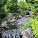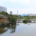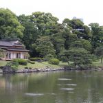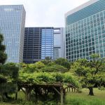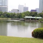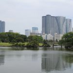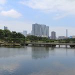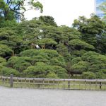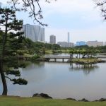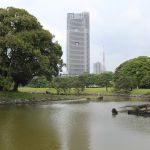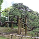 Nous nous rendons ensuite dans le jardin Hama-Rikyū, situé à proximité de Tsukiji. Ce jardin, situé dans le quartier des affaires de Shiodome, se trouve à proximité de la baie de Tōkyō, et est entouré de gratte-ciel. Le jardin n’est plus fleuri en cette époque de l’année, mais il abrite des arbres centenaires, dont un vieux pin de 300 ans, tenant comme un vieillard sur des béquilles.