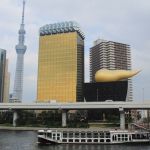 Sur l’autre rive du fleuve Sumida, nous voyons le siège social de la brasserie Asahi, connu pour la flamme posé à son sommet. Cette flamme, conçue par Philippe Starck, est généralement perçue par les Japonais comme une grande crotte de chien…et on comprend pourquoi, le design est pour le moins original. Sur la gauche, dominant largement les autres immeubles et gratte-ciel, se trouve la Tōkyō Skytree, la deuxième construction humaine la plus haute au monde avec 634m. C’est là que nous nous rendons.