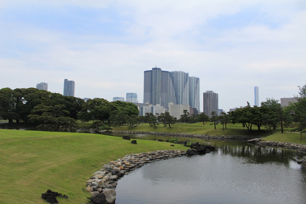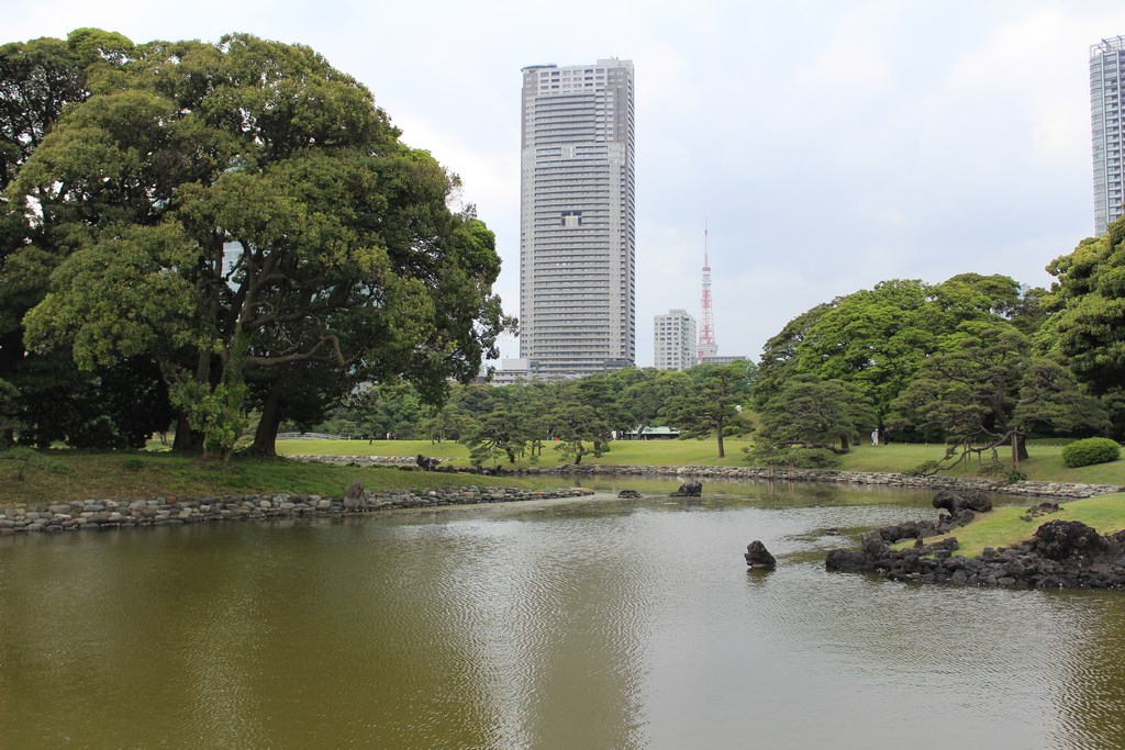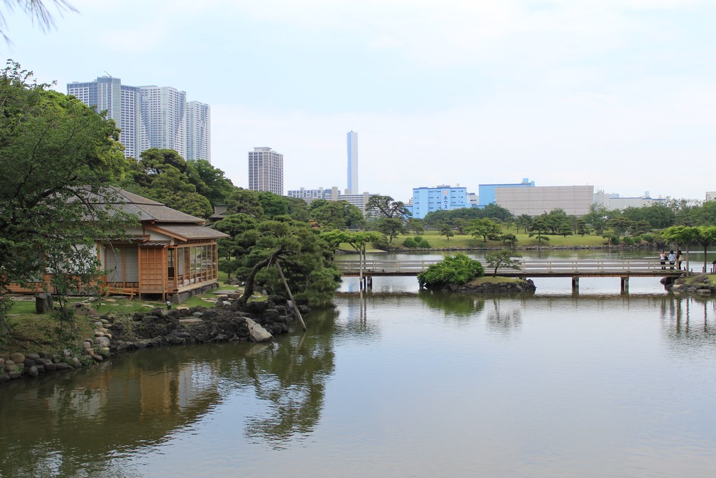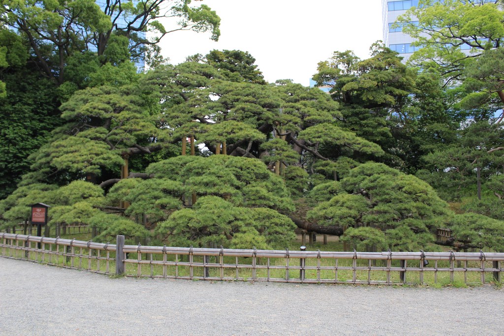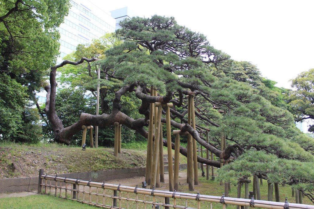 Nous nous rendons ensuite dans le jardin Hama-Rikyū, situé à proximité de Tsukiji. Ce jardin, situé dans le quartier des affaires de Shiodome, se trouve à proximité de la baie de Tōkyō, et est entouré de gratte-ciel. Le jardin n’est plus fleuri en cette époque de l’année, mais il abrite des arbres centenaires, dont un vieux pin de 300 ans, tenant comme un vieillard sur des béquilles.