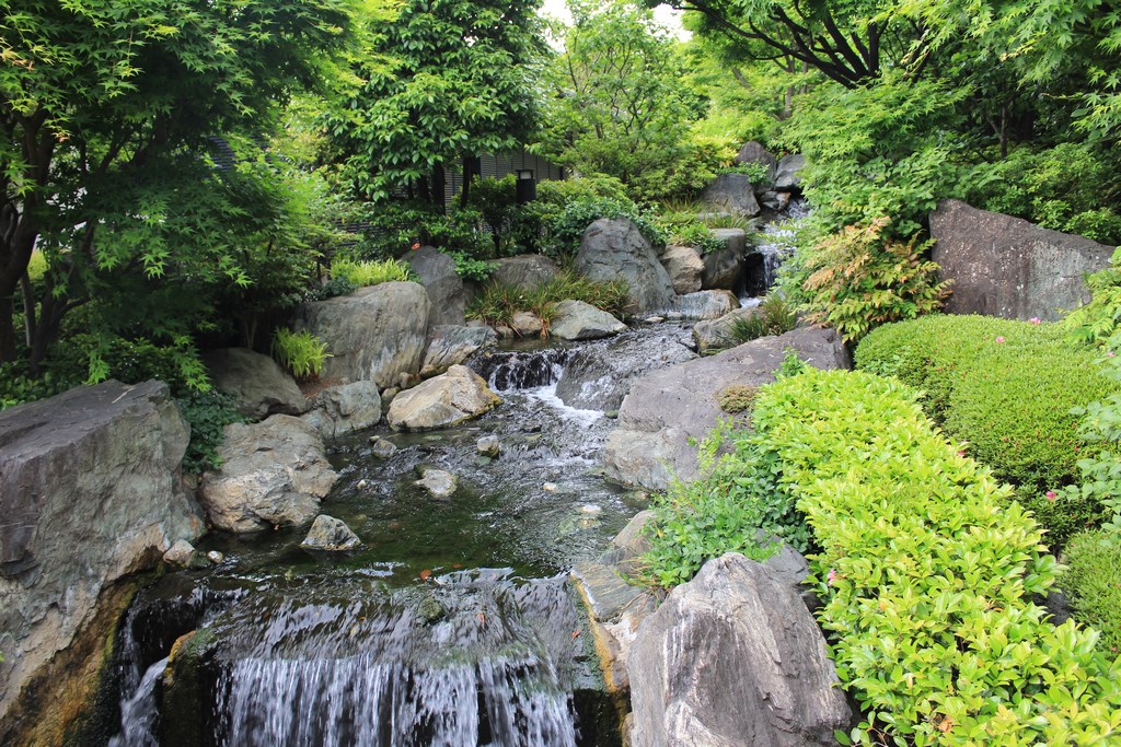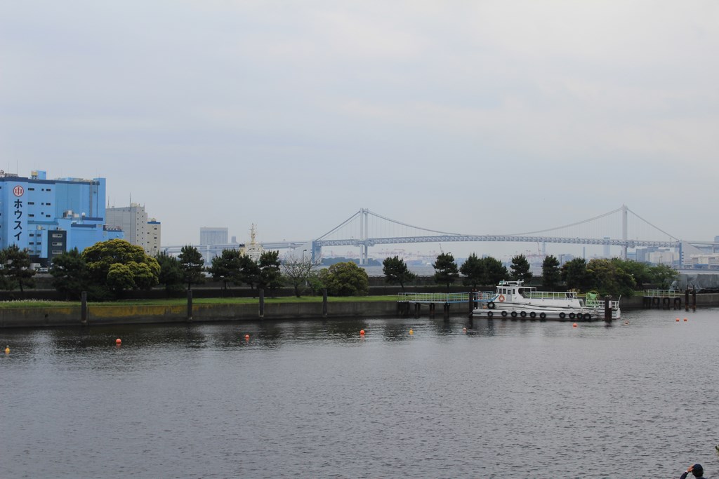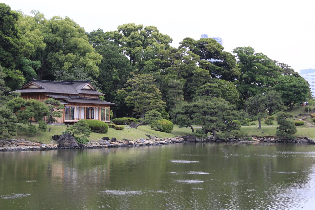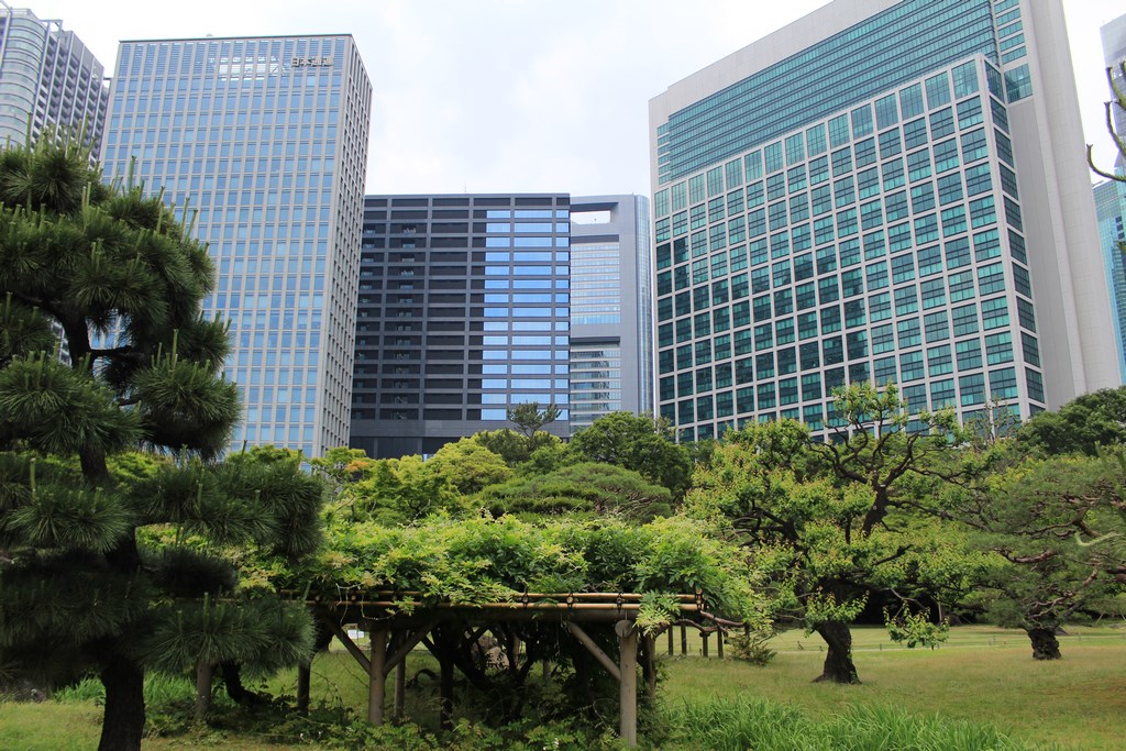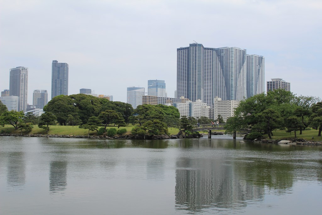 Nous nous rendons ensuite dans le jardin Hama-Rikyū, situé à proximité de Tsukiji. Ce jardin, situé dans le quartier des affaires de Shiodome, se trouve à proximité de la baie de Tōkyō, et est entouré de gratte-ciel. Le jardin n’est plus fleuri en cette époque de l’année, mais il abrite des arbres centenaires, dont un vieux pin de 300 ans, tenant comme un vieillard sur des béquilles.