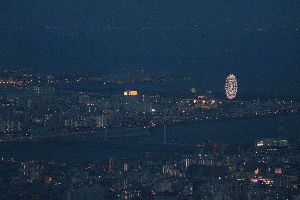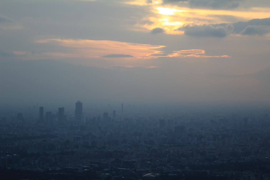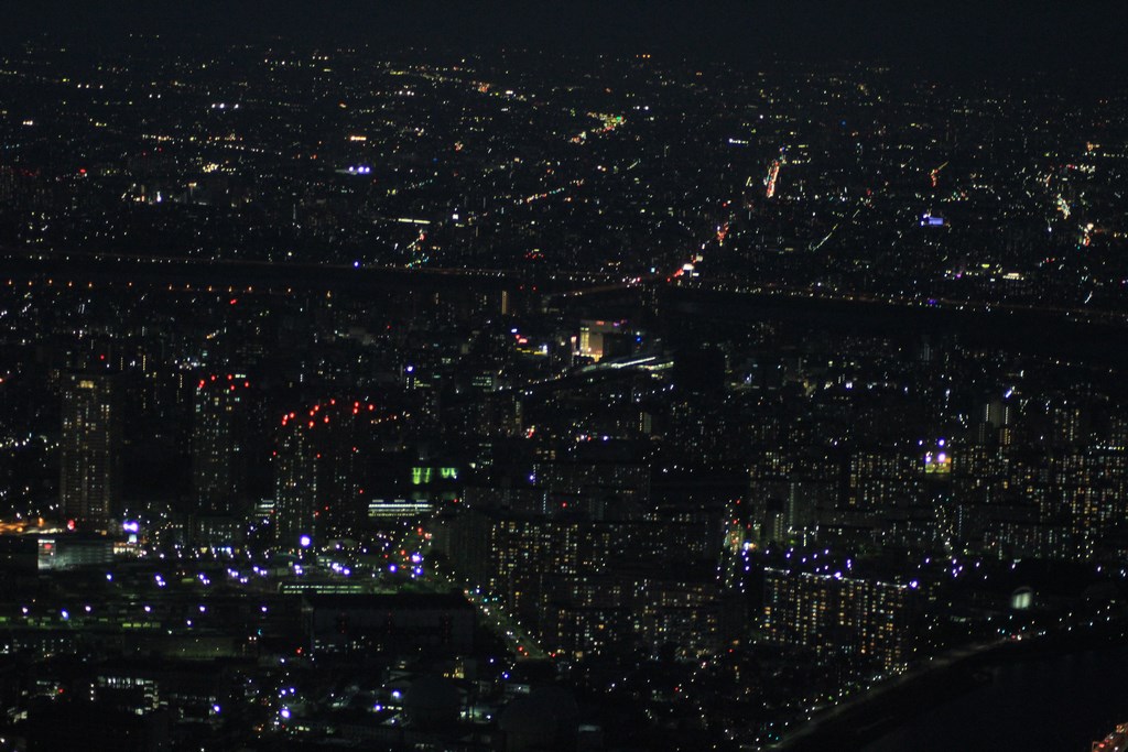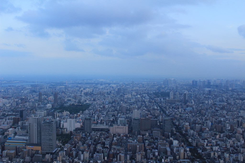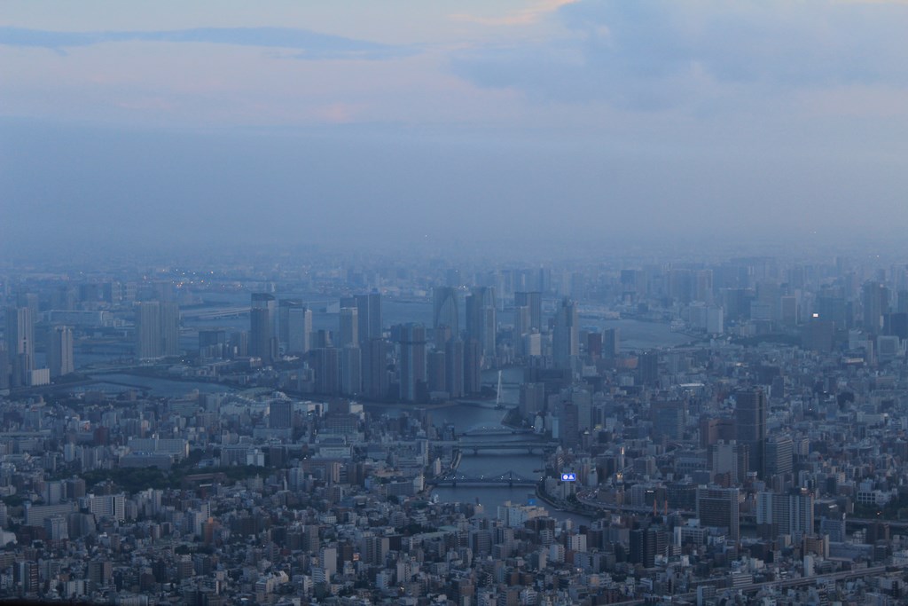 Nous entrons au rez-de-chaussée, et, après avoir payé notre ticket, sommes dirigés vers un ascenseur pour monter vers un premier palier à 350m. Avec sa vitesse d’ascension de 600 mètres par minute, nous y arrivons rapidement. De là, nous avons une vue imprenable sur tout Tōkyō. Le soleil est bas, et ne vas pas tarder à se coucher. Nous décidons de monter au deuxième palier, situé à 450m de haut, et d’attendre la tombée de la nuit pour profiter de la vue nocturne de Tōkyō.