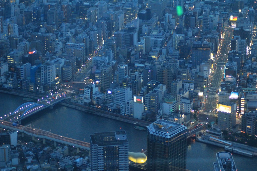 Sur l’autre rive du fleuve Sumida, nous voyons le siège social de la brasserie Asahi, connu pour la flamme posé à son sommet. Cette flamme, conçue par Philippe Starck, est généralement perçue par les Japonais comme une grande crotte de chien…et on comprend pourquoi, le design est pour le moins original. Sur la gauche, dominant largement les autres immeubles et gratte-ciel, se trouve la Tōkyō Skytree, la deuxième construction humaine la plus haute au monde avec 634m. C’est là que nous nous rendons.