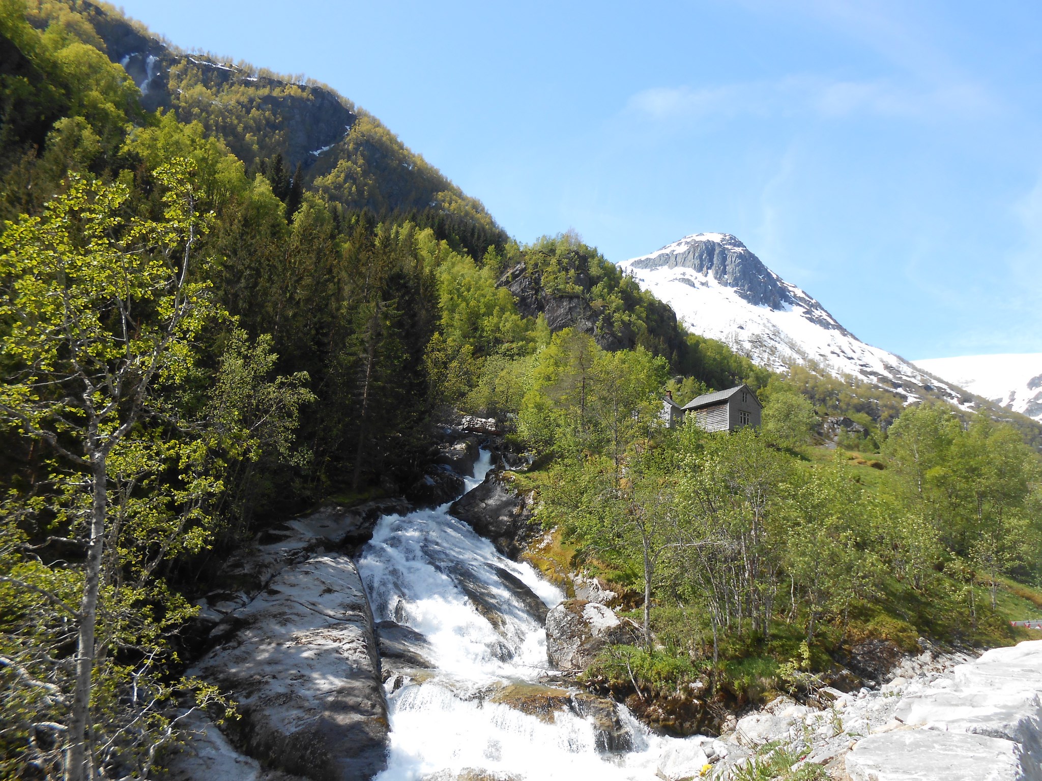 Nous reprenons ensuite la route en direction du glacier de Buer, faisant partie du glacier de Folgefonna. Sur le parking situé au départ de la randonnée, une pancarte indique que le chemin vers le glacier est fermé. Nous avançons tout de même en nous disant que nous pourrons au moins gravir quelques kilomètres, mais nous sommes très vite stoppés par des barrières. Inutile de continuer, nous décidons de retourner vers la voiture.