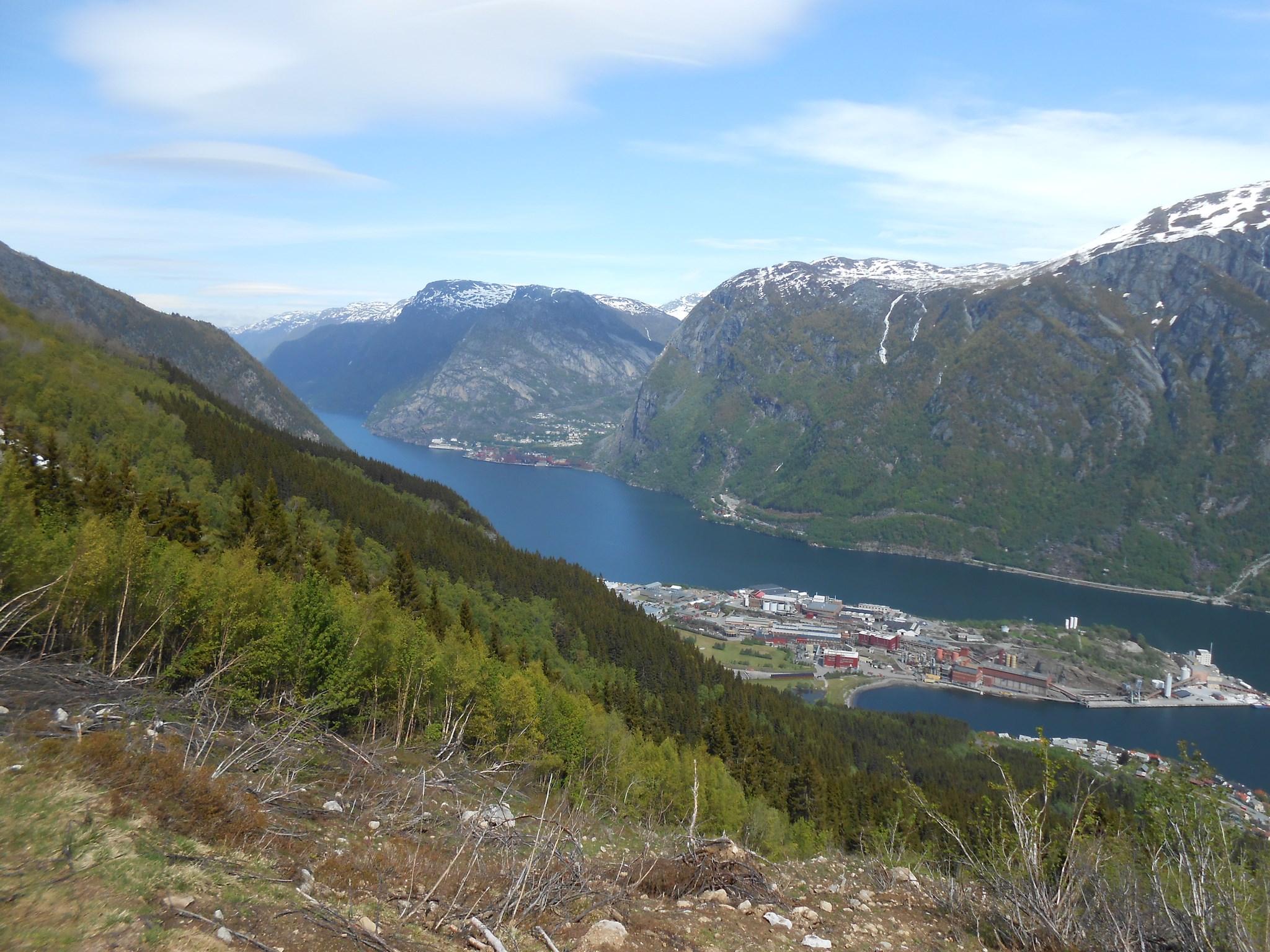 A 500m d’altitude, nous sommes alors stoppés par la neige, qui couvre l’accès au sentier. Nous décidons de ne pas nous aventurer plus loin, et de faire demi-tour. Au moins, nous avons profité du beau temps, et de la vue en contrebas de la ville d’Odda sur le fjord.